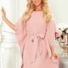 Sportowa sukienka z rękawkiem 3/4 i kieszonkami – druk – beżowy len + czerwone kwiaty. Wykonana z elastycznego materiału z lekko zamszową strukturą. Produkt polski. Marka numoco.