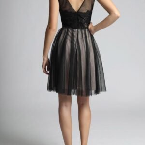 Elegancka sukienka z głębokim dekoltem, zapinana na kryty zamek. Sukienka wykonana z tiulu i koronki. Idealna na wiele okazji.