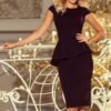 Elegancka sukienka midi z asymetryczną baskinką i małym rękawkiem – lila – jasny fiolet. Sukienka optycznie wyszczupli talię oraz ukryje niedoskonałości w okolicach bioder. Marka Numoco.