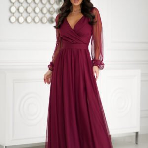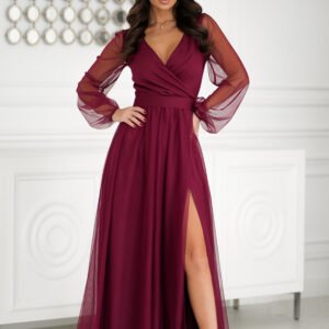 Piękna długa sukienka, niezwykle zgrabna, uszyta ze zwiewnej tkaniny. Góra z delikatnym dekoltem, dół dwuwarstwowy z wycięciem na nodze, dodającym kreacji powabności. Sukienka zapinana na kryty zamek. Do sukienki dołączony pasek. Dostępna w modnych kolorach.