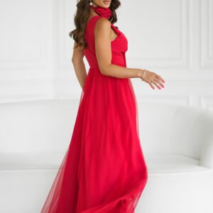 Piękna, długa sukienka, która zachwyca swoim niezwykłym krojem. Uszyta ze zwiewnej tkaniny, idealnie podkreśla sylwetkę. Góra sukienki posiada delikatny dekolt, a dwuwarstwowy dół z wycięciem na nodze dodaje kreacji powabności. Do sukienki dołączony jest pasek z różyczką, który można owinąć na wiele sposobów, zarówno na szyję, jak i na talię, co pozwala na indywidualne dopasowanie stylizacji.