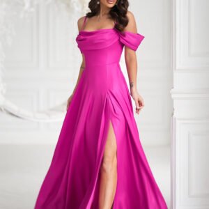 Dopasowana góra podkreśla talię, a długa, zwiewna spódnica optycznie wysmukla sylwetkę. Efektowne rozcięcie dodaje lekkości i swobody ruchu. Wykonana z miękkiego, połyskującego materiału, który delikatnie mieni się przy każdym kroku. Sukienka zapinana na kryty zamek. Góra sukienki posiada podszewkę, dół bez podszewki. Idealna na wyjątkowe okazje, łączy klasę i komfort.