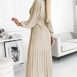 Plisowana szyfonowa sukienka z dekoltem, długim rękawkiem i paskiem. Plisowanie na dekolcie i rękawku dodaje sukience elegancji. Sukienka w kolorze beżowym. Marka numoco.