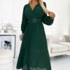 Plisowana szyfonowa sukienka z dekoltem, długim rękawkiem i paskiem. Plisowanie na dekolcie i rękawku dodaje sukience elegancji. Sukienka w kolorze bordowym. Marka numoco.