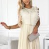 Kobieca sukienka z falbankami, podwójną spódniczką, kopertowym dekoltem i paskiem. Uszyta z szyfonowego materiału na podszewce. Sukienka z materiału w róże na białym tle. Marka numoco. Produkcja europejska.