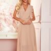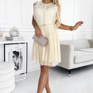 Sukienka z koronką, tiulową spódnicą i złotym paskiem. Sukienka w kolorze beżowym. Marka numoco. Produkcja europejska.