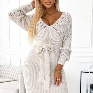 Ażurowa sukienka z długim rękawkiem, dekoltem i wiązaniem. Uszyta ze sweterkowego ciepłego materiału w kolorze beżowym. Można ją również nosić na jedno ramię. Produkcja europejska. Marka numoco basic.