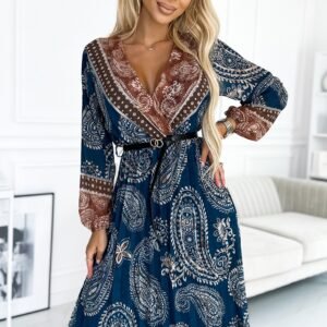 Szyfonowa plisowana sukienka midi z dekoltem, długim rękawkiem i czarnym paskiem. Wzór: niebieski z brązem. Marka numoco basic. Produkcja europejska.