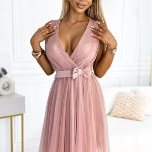 Kobieca tiulowa sukienka z dekoltem i satynową kokardką. Tył sukienki uszyty został z elastycznej gumonitki, dzięki czemu dopasuje się do większości rozmiarów. Sukienka w kolorze brudnego różu. Marka numoco basic. Produkt europejski.