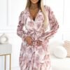 Kopertowa sukienka w brzoskwiniowe kwiaty na jasnym tle. Uszyta z przyjemnego w dotyku materiału (95% poliester, 5% elastan). Marka numoco. Produkcja polska.