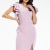 Elegancka sukienka z ozdobną falbaną przy dekolcie. Sukienka o dopasowanym kroju, z rozcięciem z tyłu.
