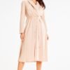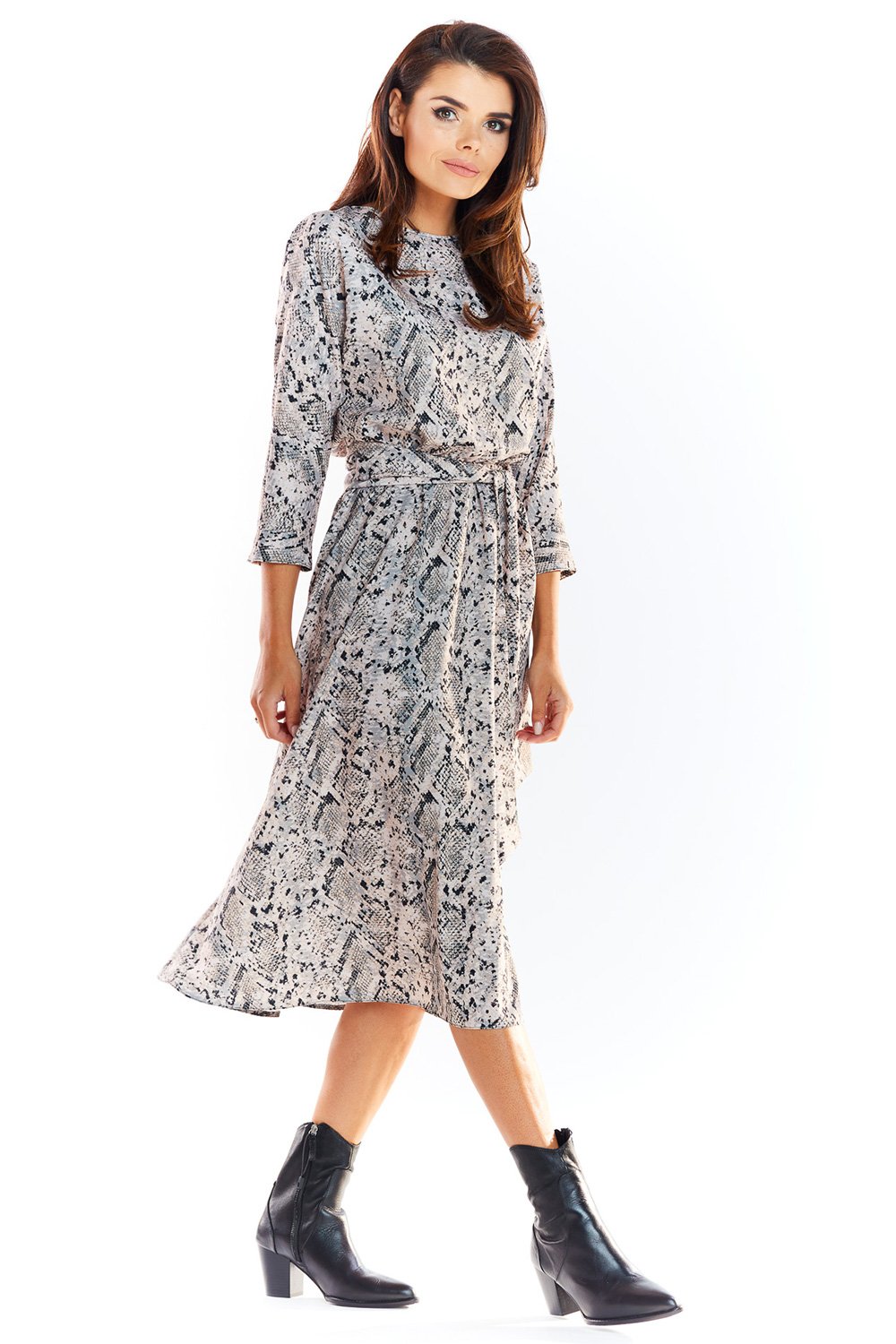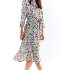 Sukienka midi z rękawem 3/4. Sukienka uszyta z materiału w modne wzory. W talii gumka, oraz wszyty ozdobny pasek, dzięki któremu sukienka idealnie dopasowuje się do figury. Sukienka ma niezwykle kobiecy charakter, idealnie ukrywa mankamenty figury. Idealna do pracy i na popołudniową kawę. Produkt wyprodukowany w Polsce.