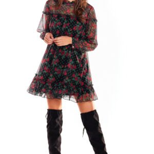 Sukienka mini z długimi rękawami. Ma elastyczną podszewkę. Uszyta z szyfonu w najmodniejszych printach sezonu. Szeroki dół sukienki sprawia, że pięknie układa się podczas chodzenia. Świetnie wygląda z botkami jak i długimi kozakami