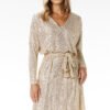 Sukienka uszyta z materiału w cekiny. Kopertowy dekolt nadaje jej kobiecy charakter. Kopertowy dół sukienki pozwala wyeksponować nogi. Długie, szerokie, lejące rękawy zakończone mankietem z gumką. Elastyczna gumka w talii zapewnia idealne dopasowanie do sylwetki. Sukienkę wyprodukowano w Polsce