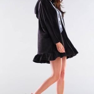 Bluza o oversizowym kroju z kapturem. Bluza o kroju sukienki. Uroku dodają jej taśmy z logiem firmy, oraz falbanka u dołu. Wewnętrzna strona kaptura wykonana jest z materiału w literki. Produkt zaprojektowany i wyprodukowany w Polsce.