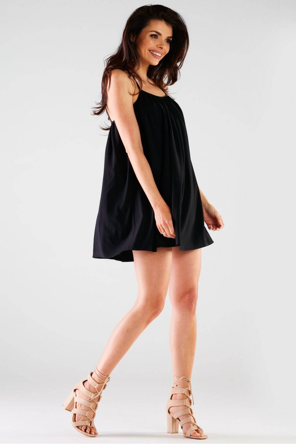 Luźna sukienka mini o trapezowym kroju. Odsłonięte plecy wyeksponowane są ozdobnie połączonymi ramiączkami.