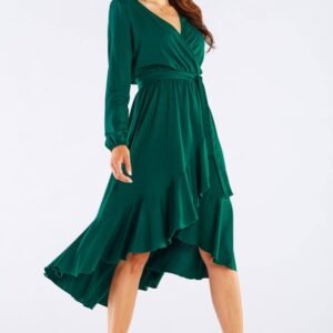 Sukienka damska wykonana z naturalnej wiskozy. Kopertowy dekolt dodaje eleganckiego stylu. Wiązanie w talii podkreśla figurę. Wykończona zachodzącymi na siebie falbankami, które dodają jej lekkości. Rękawy zakończone gumkami pozwalają na łatwą regulację ich długości. Produkt wyprodukowany w Polsce.