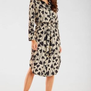 Sukienka o kroju wydłużonej koszuli, z długimi rękawami, zapinana z przodu na guziki. Do sukienki dodajemy pasek z tego samego materiału, który ma być wiązany w talii. Produkt wyprodukowany w Polsce.