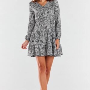 Sukienka mini A470 z długim rękawem zakończonym gumką. Posiada delikatny, kobiecy dekolt w literę V. Poprzeczne przeszycia tworzą falbanki dodające sukience uroku. Prezentowany model to świetna propozycja na spotkania ze znajomymi oraz na bardziej formalne spotkania. Bardzo dobrze prezentuje się zarówno z białymi sneakersami jak i szpilkami.