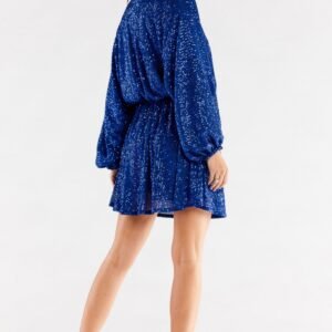 Luźna, krótka sukienka w jednym rozmiarze z szerokimi rękawami, zakończonymi marszczeniem z gumką. Dekolt w serek, w pasie marszczona gumką w celu dopasowania do sylwetki. Sukienka uszyta na elastycznej podszewce. Sukienka wyprodukowana w Polsce.