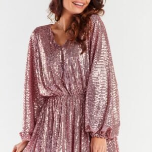 Luźna, krótka sukienka w jednym rozmiarze z szerokimi rękawami, zakończonymi marszczeniem z gumką. Dekolt w serek, w pasie marszczona gumką w celu dopasowania do sylwetki. Sukienka uszyta na elastycznej podszewce. Sukienka wyprodukowana w Polsce.