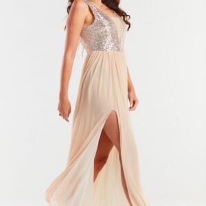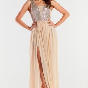 Długa, elegancka suknia z odkrytymi plecami. Góra odszyta cekinami z dodatkiem wstawki z delikatnej siateczki, która zdobi również cały dół kreacji. Sukienka uszyta na elastycznej podszewce. Sukienka wyprodukowana w Polsce.