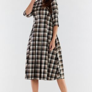 Rozkloszowana sukienka midi z rękawem 3/4, zapinana na kryty zamek. Uszyta z tkaniny w modną kratę. Fason sukienki optycznie modeluje sylwetkę i podkreśla kobiecość. Idealna zarówno na rodzinne uroczystości, jak i na służbowe spotkania w biurze. Zaprojektowano i uszyto w Polsce.