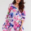 Sukienka z szyfonu na elastycznej podszewce, ozdobiona na dole dwiema falbanami, asymetryczna. Dekolt z tyłu również jest ozdobiony falbaną i mocno wycięty. Sukienka ma gumkę wszytą w pasie, w celu dopasowania do sylwetki.