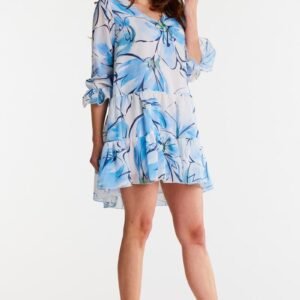 Luźna sukienka z szyfonu na elastycznej podszewce, z dwiema falbanami na dole i małymi falbanami przy rękawach.