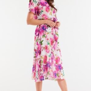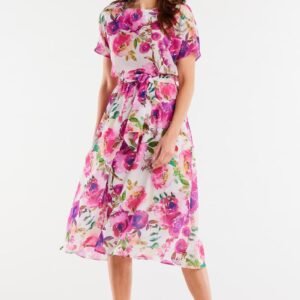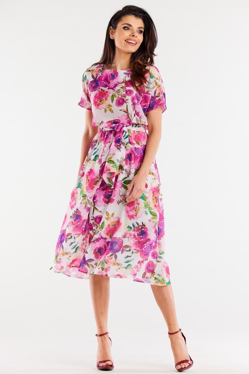Sukienka z szyfonu na elastycznej podszewce, regulowana w pasie paskiem, lekko rozkloszowana na dole.