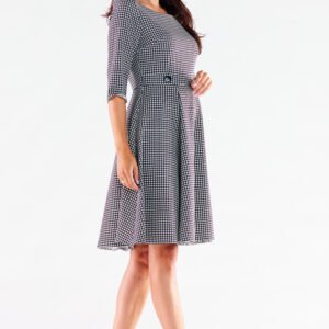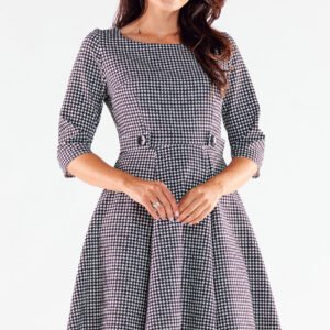 Rozkloszowana sukienka z krótkimi rękawami. Delikatnie rozszerza się ku dołowi. Dzięki ozdobnym guzikom na wysokości talii sylwetka wydaje się smuklejsza. Produkt wyprodukowany w Polsce.