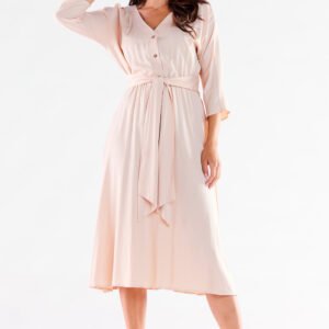 Sukienka midi z trapezowym dołem zapinana na guziki, w komplecie z paskiem w kolorze. Sukienka midi to must have tego sezonu! Optycznie wysmukla sylwetkę. Lekka, przewiewna, świetnie się sprawdzi jako sukienka na każdą okazję! Zaprojektowano i uszyto w Polsce.