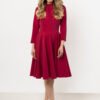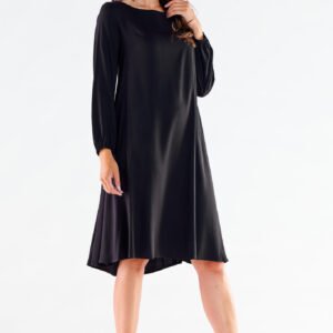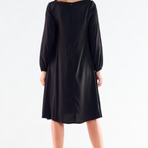 Damska sukienka o trapezowym kroju z delikatnie przedłużonym tyłem. Sukienka posiada długi rękaw zakończony gumką. Sukienka sprawdzi się jako stylizacja codzienna a także wieczorowa, do kawiarni, na spotkanie z przyjaciółką. Produkt wyprodukowany i uszyty w Polsce.