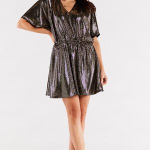 Krótka, rozkloszowana sukienka z krótkim rękawkiem i dekoltem w serek. W pasie marszczenie gumką w celu dopasowania do sylwetki. Sukienka uszyta na elastycznej podszewce. Sukienka wyprodukowana w Polsce.
