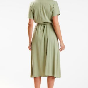 Sukienka o długości midi, z krótkim rękawem o kimonowym kroju. Uszyta z miękkiej wiskozy. Idealna do pracy i na popołudniową kawę. Sukienka posiada szarfę do przewiązania w talii, dzięki temu podkreśla ona atuty sylwetki. Niezwykle kobieca i zwiewna. Pięknie układa się podczas noszenia. Produkt wyprodukowany w Polsce.