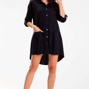 Luźna, koszulowa sukienka z kołnierzykiem o trapezowym kroju. Długi rękaw z możliwością podwinięcia i zapięcia na guzik sprawia, że jest to idealna kreacja na chłodniejsze wieczory. Sukienka zapinana na złote, okrągłe guziki. Idealna do pracy i na niezobowiązujące spotkania. Świetnie pasuje zarówno do trampek jak i do butów na obcasie. Uszyta z przewiewnej i naturalnej wiskozy. Zaprojektowano i uszyto w Polsce.