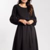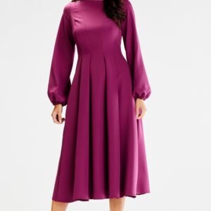Rozkloszowana sukienka o długości midi z długim rękawem zakończonym gumką. Zapinana z tyłu na kryty zamek. Elegancka, z dekoltem w łódkę i dopasowaną górą jest idealną propozycją na różnego rodzaju spotkania.