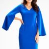 Sukienka midi z dekoltem w serek i rozciętymi rękawami, które dodają jej niepowtarzalny charakter. Model ten optycznie wyszczupla sylwetkę dzięki pionowym zaszewkom.
