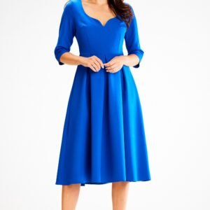 Elegancka sukienka z rozkloszowanym dołem i dopasowaną górą. Sukienka z pięknym i niepowtarzalnym dekoltem który podkreśla kobiece kształty. Jest zapinana z tyłu na zamek kryty.