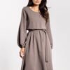 Luźna sukienka z rozkloszowanym dołem i długimi rękawami. W pasie dopasowana gumką i przewiązana szeroką szarfą.