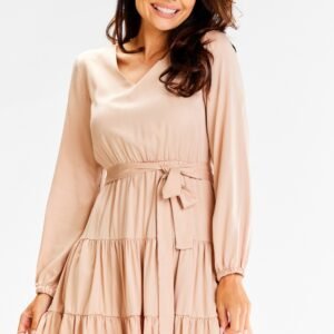 Sukienka z długimi rękawami i z falbanami, dzięki którym dół jest rozkloszowany. Sukienka ma w pasie wszytą gumkę w celu dopasowania do sylwetki, dodatkowo jest przewiązana paskiem. Propozycja idealna na wiele okazji.