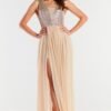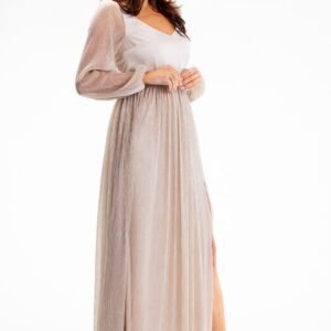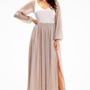Sukienka maxi z efektownym rozcięciem przy lewej nodze. Błyszcząca siateczka, z której wykonane są rękawy i dół, przykuwa spojrzenia, nadając całej kreacji subtelnego blasku. Góra sukienki z głębokim dekoltem, wykonana z gładkiej satyny.
