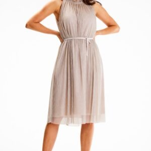 Lekka sukienka midi z ozdobną stójką oraz dekoltem typu halter. Posiada w zestawie cienki, satynowy pasek. Wykonana z błyszczącej siatki i satynowej podszewki.