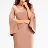 Dopasowana sukienka midi z rozcięciem oraz dekoltem w serek. Sukienka posiada podwójną falbankę przy ramionach. Sukienka zapinana na zamek kryty. To doskonały wybór na uroczystości typu wesela czy komunie.