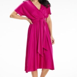 Rozkloszowana sukienka midi z kopertową górą i krótkim, kimonowym rękawkiem. Idealna do pracy i na kawę z przyjaciółką. Sukienka posiada szarfę do przewiązania w talii, dzięki temu podkreśla ona atuty sylwetki.
