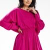 Prosta sukienka mini z gumką w pasie, dzięki czemu dopasowuje się do sylwetki. Posiada ona krótki rękaw oraz dekolt w łódkę. Dodatkowym atutem są kieszenie wsuwane. Jest to propozycja na ciepłe, letnie dni.