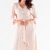 Prosta sukienka mini z gumką w pasie, dzięki czemu dopasowuje się do sylwetki. Posiada ona krótki rękaw oraz dekolt w łódkę. Dodatkowym atutem są kieszenie wsuwane. Jest to propozycja na ciepłe, letnie dni.
