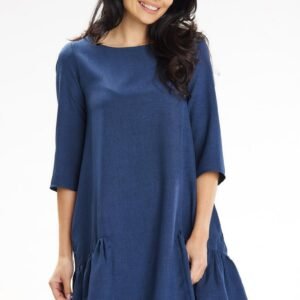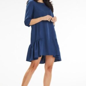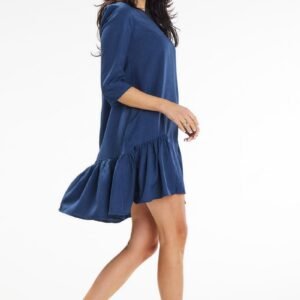 Luźna sukienka trapezowa o długości mini, z rękawami 3/4. Zapinana na zamek kryty. Zdobiona falbanką na dole, dodatkowo posiada kieszenie w szwie. Model ten sprawdzi się na letnie dni spędzone w gronie znajomych.
