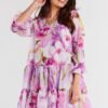 Przewiewna letnia sukienka. Uszyta jest z lekkiego szyfonu, dzięki czemu jest idealna na upalne dni. Rozcięcia na rękawach pięknie eksponują ramiona, a gumka w pasie sprawia że sukienka dopasowuje się do sylwetki. Dół sukienki na podszewce.