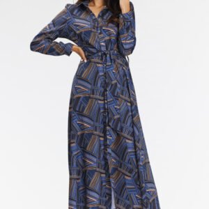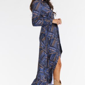 Sukienka koszulowa maxi. Odkryj nową definicję elegancji z naszą sukienką koszulową maxi, idealną na każdą okazję, od pracy po spotkania. Casualowy styl łączy się z funkcjonalnością, a przewiązanie szarfą w talii dodaje jej uroku. Długie rękawy, zapięcie na guziki i granatowo-brązowy wzór wprowadzają nowoczesny charakter do codziennych stylizacji. Sukienka została uszyta z wysokiej jakości materiału, który zapewnia komfort noszenia. Możliwość regulacji rękawów i zapięcie na guziki dodają wszechstronności, idealnej na każdą porę roku. Idealna na co dzień, do pracy i na spotkania, dzięki przewiązaniu w talii sukienka dopasowuje się do sylwetki.